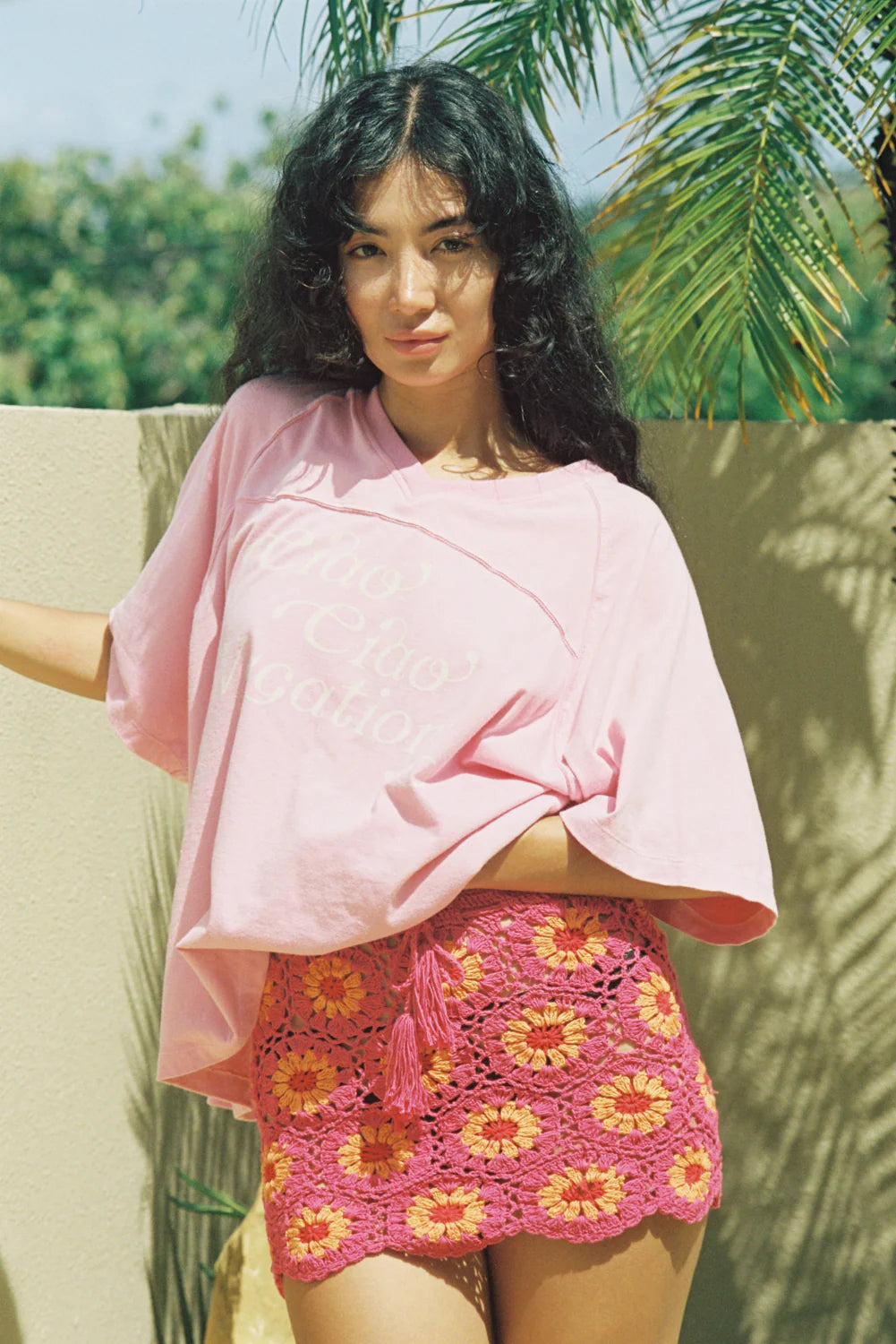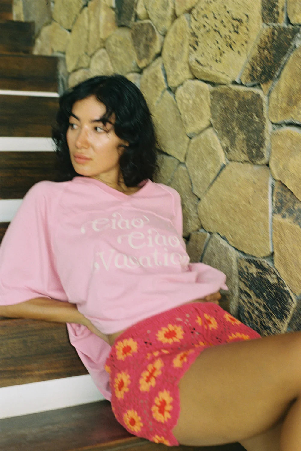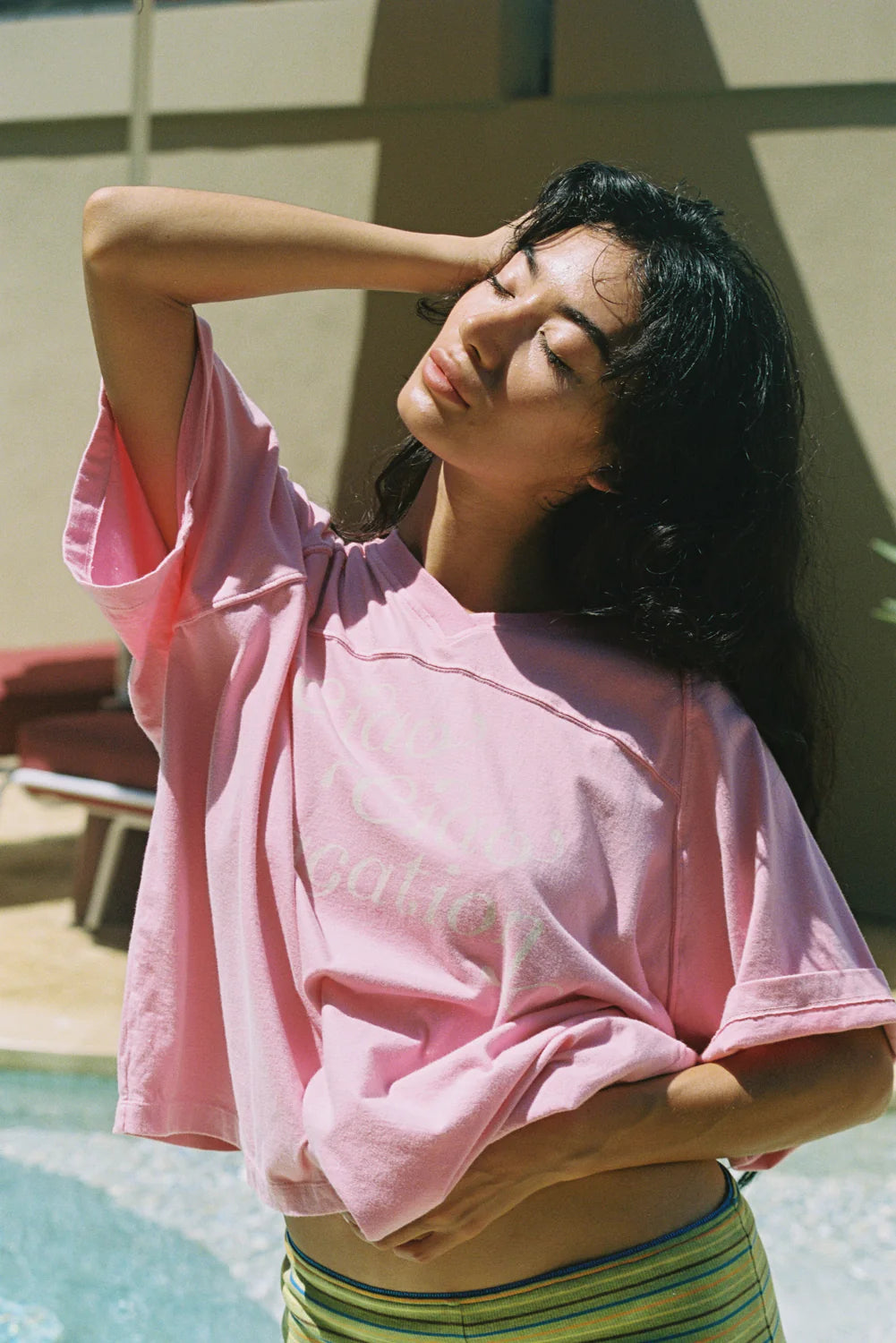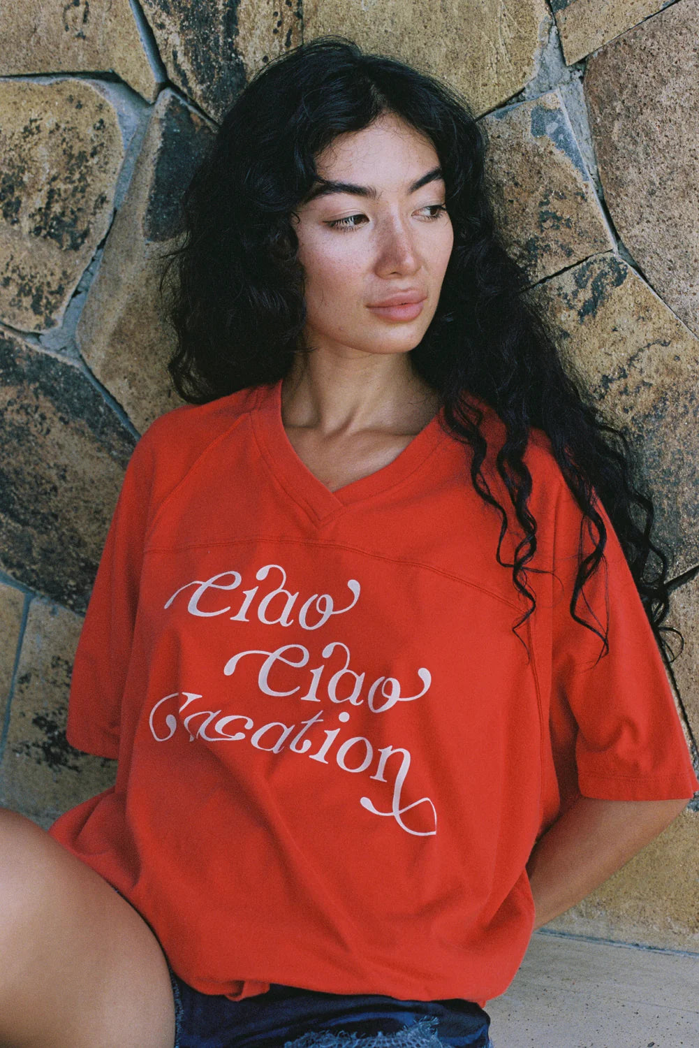 The Vacay Crop Tee in bold, sun-kissed red brings pure holiday energy wherever you go. With its relaxed cropped fit, breezy sleeves and signature Ciao Ciao Vacation script, she’s made for salty hair, iced drinks and zero responsibilities.