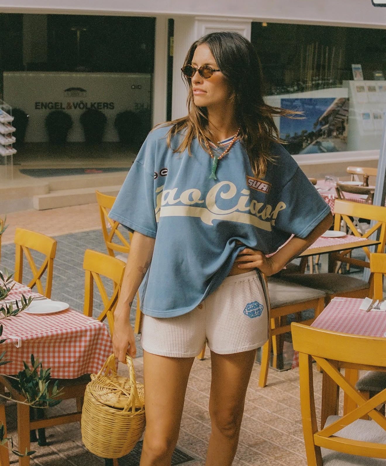 GAME ON IN THE CIAO CIAO SPORT JERSEY! A BEST-SELLER NOW BACK, BUT NOT FOR LONG! FEATURING RETRO ATHLETIC-INSPIRED DETAILS WITH CONTRAST BROWN AND CREAM TRIM, BOLD CIAO CIAO BRANDING, AND A RELAXED OVERSIZED FIT. YOUR NEW GO-TO FOR EFFORTLESS VACATION DRESSING AND WEEKEND WEAR. PAIR WITH THE ALL SORTS RUNNER FOR A COORDINATED SET THAT BRINGS NOSTALGIC VIBES TO YOUR EVERYDAY WARDROBE.