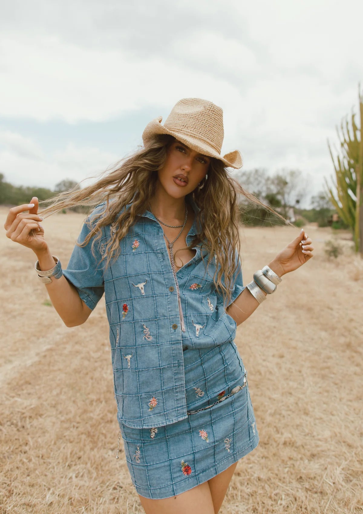 A fitted denim-look skirt with a patchwork feel, true to size with a brass-look rear zip for a touch of vintage utility. Embroidered desert motifs—each drawn from hand-painted works by Whitney Spicer—are carefully placed across the silhouette, adding texture and story to every panel.